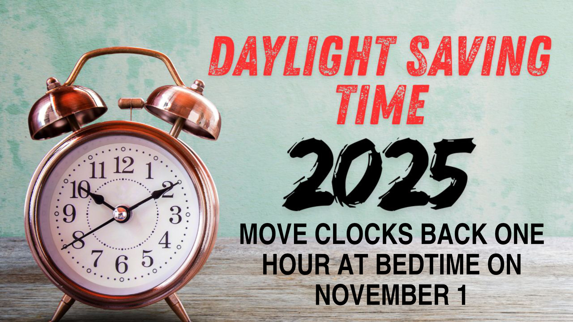 Daylight Saving Time ends this weekend. Be sure to move your clocks BACK ONE HOUR at bedtime on Saturday the 1st.